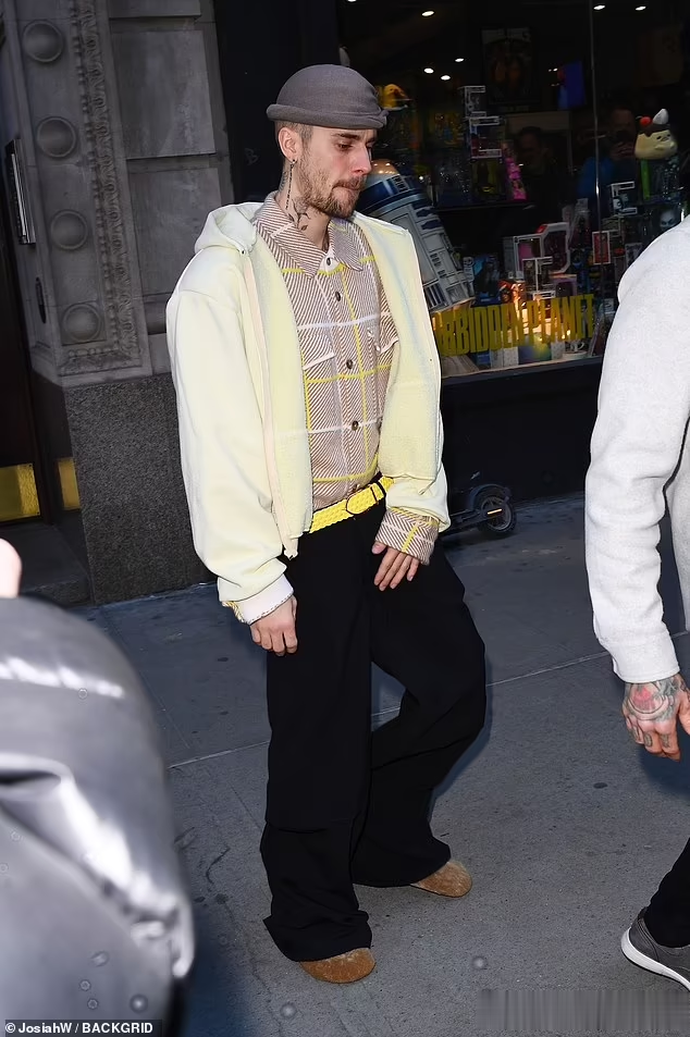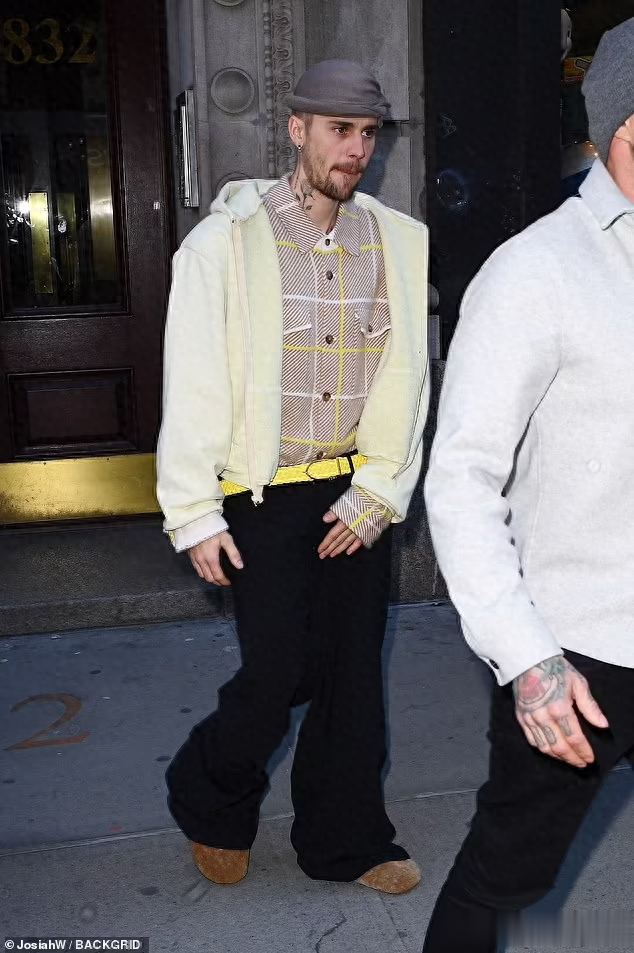 比伯的穿搭延续了他一贯的蓬乱时尚风格,一件板正的格子衬衫外面套了一件暖黄色的帽衫外套,头上戴了一顶灰色帽子。